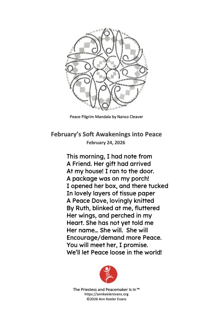 Oh, Ruth, she is beautiful. I’m back working in my office after a year, which is now presided over by Peace. Her song calls us to gather, to explore, and to Love. I love the way you are gifting your Art in support of all you support. The Red Hat I received from Lenore, keeps me warm and connected as well. I give thanks and honor for your gifts.