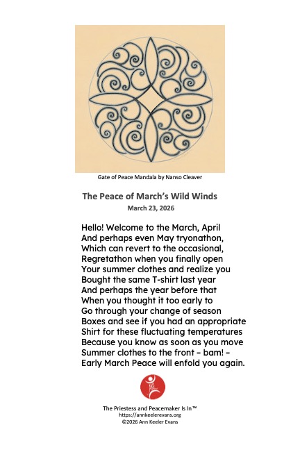 It may have been a blue sky when I wrote this, and warming. It may be a rainy sky when you read this and cooling. Enjoy the Peace of March’s Wild Winds.
