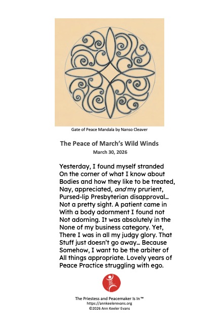 It doesn’t get easier! It doesn’t get less unattractive. But, that’s the Peace Path, and this judgementalism seems unpleasantly predestined to be my struggle. (a Presbyterian joke, right, Sam?)